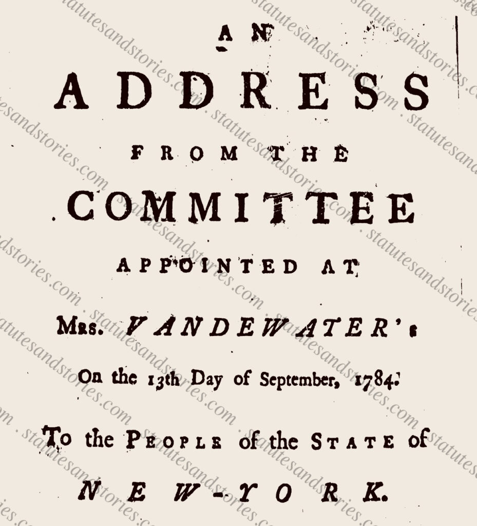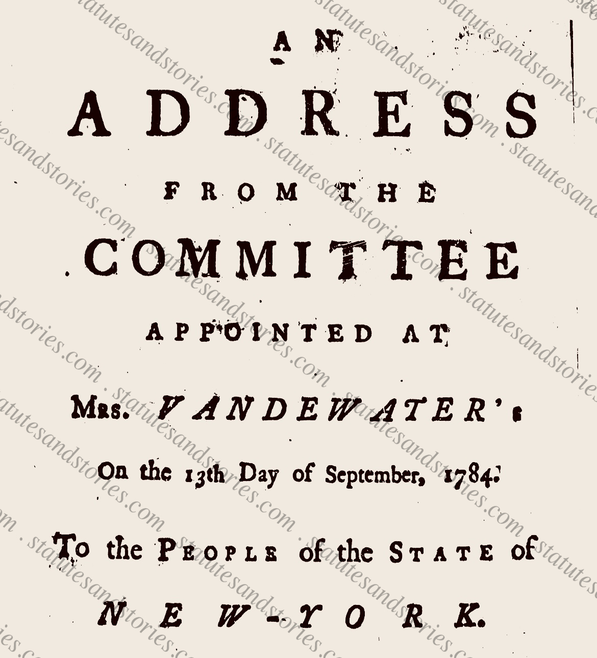 During the war, Hamilton had written as the Continentalist that “[p]ower without revenue….is a name.”[51] In 1786, Hamilton submitted a petition to the New York legislature advocating in favor of the impost. Hamilton observed that “New York now stands almost alone in a non compliance.”[52] He explained that “[g]overnment without revenue cannot subsist.”[53] Hamilton’s impost petition was printed in the papers. The public was also invited to coffee houses to sign, including Van der Waters, the same location where Smith’s committee met in 1784 to challenge the Rutgers case.