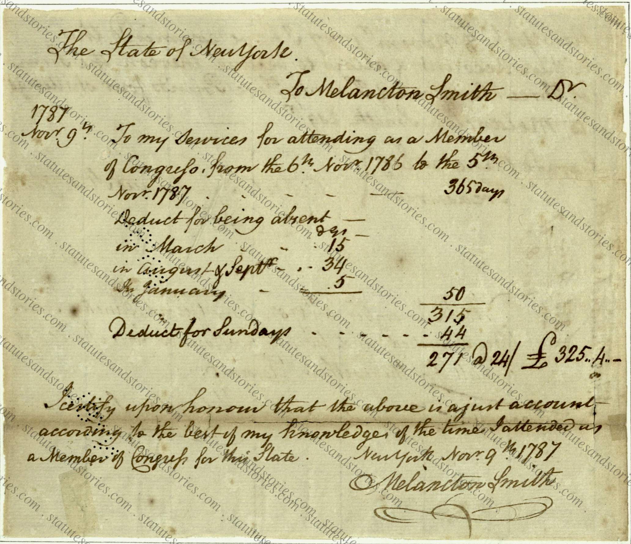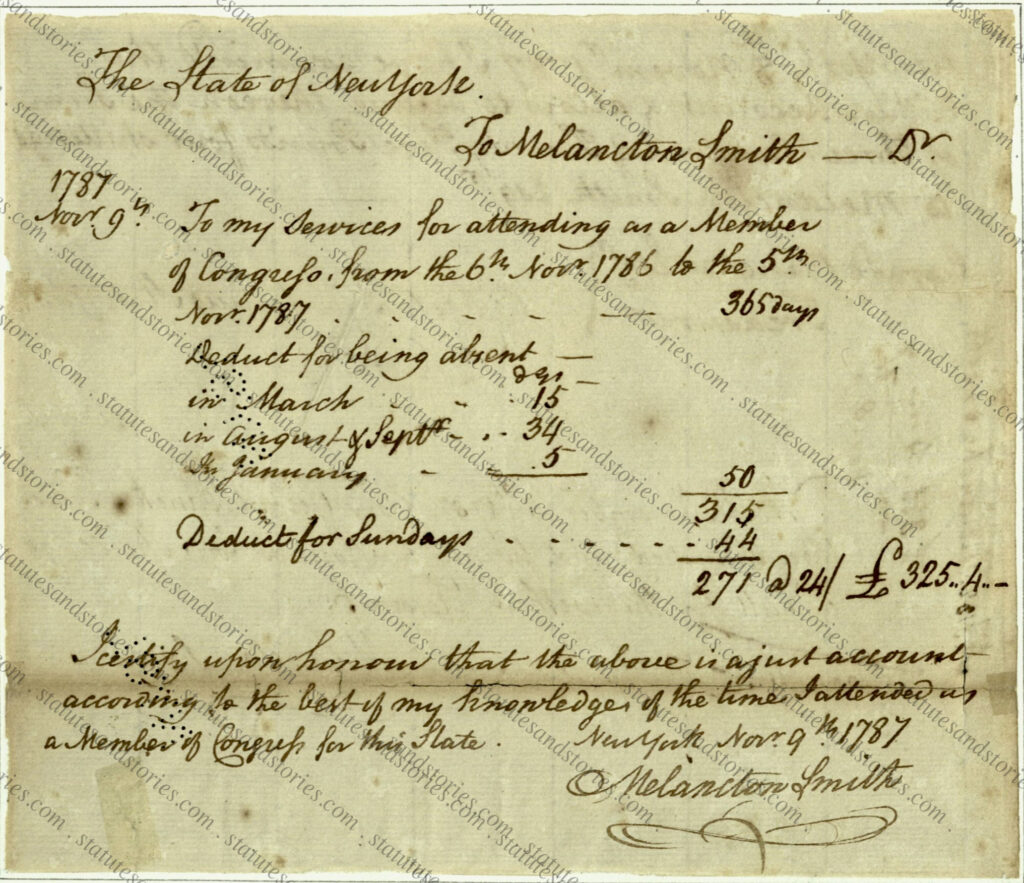 Congressman Melancton Smith was one of three New York delegates[89] who were present when Congress debated the Constitution from September 26th to 28th. All three supported efforts by Antifederalists in Congress to attach a bill of rights to the Constitution before sending it to the states. Smith’s own handwritten notes of the Congressional proceedings in September indicate, not surprisingly, that he was an early and leading Antifederalist. For example, Smith seconded Richard Henry Lee’s motion on September 27 to acknowledge the limitations on the power of Congress to amend the Articles of Confederation. The behind-the-scenes compromise reached in Congress resulted in a quiet, ministerial transmittal of the Constitution to the states without approbation or disapproval.[90] Melancton Smith’s notes of the secretive deliberations in Congress are the best source of this early, tense debate between Federalists and Antifederalists.[91]