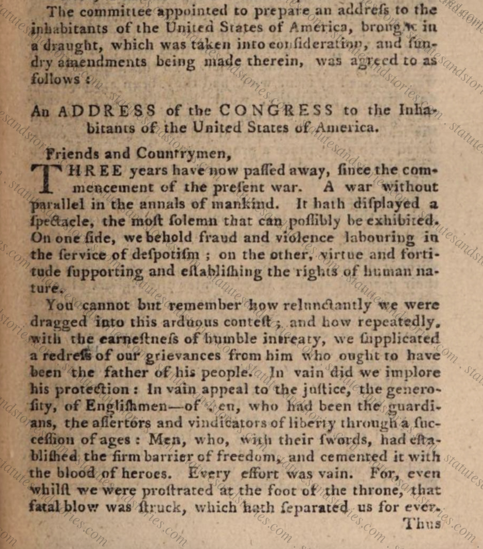 Congress was ready for the Carlisle Commission when the formal dispatch from London arrived on June 13. Another three-member committee had been directed to prepare an address to the American public.[49] The “Address of the Congress to the Inhabitants of the United States of America” was drafted by Morris. Designed to warn the public of the danger of the seductive offer from Britain, Congress recommended that ministers of all denominations read Morris’s address in their “respective churches, chapels and other places of worship.”[50]
