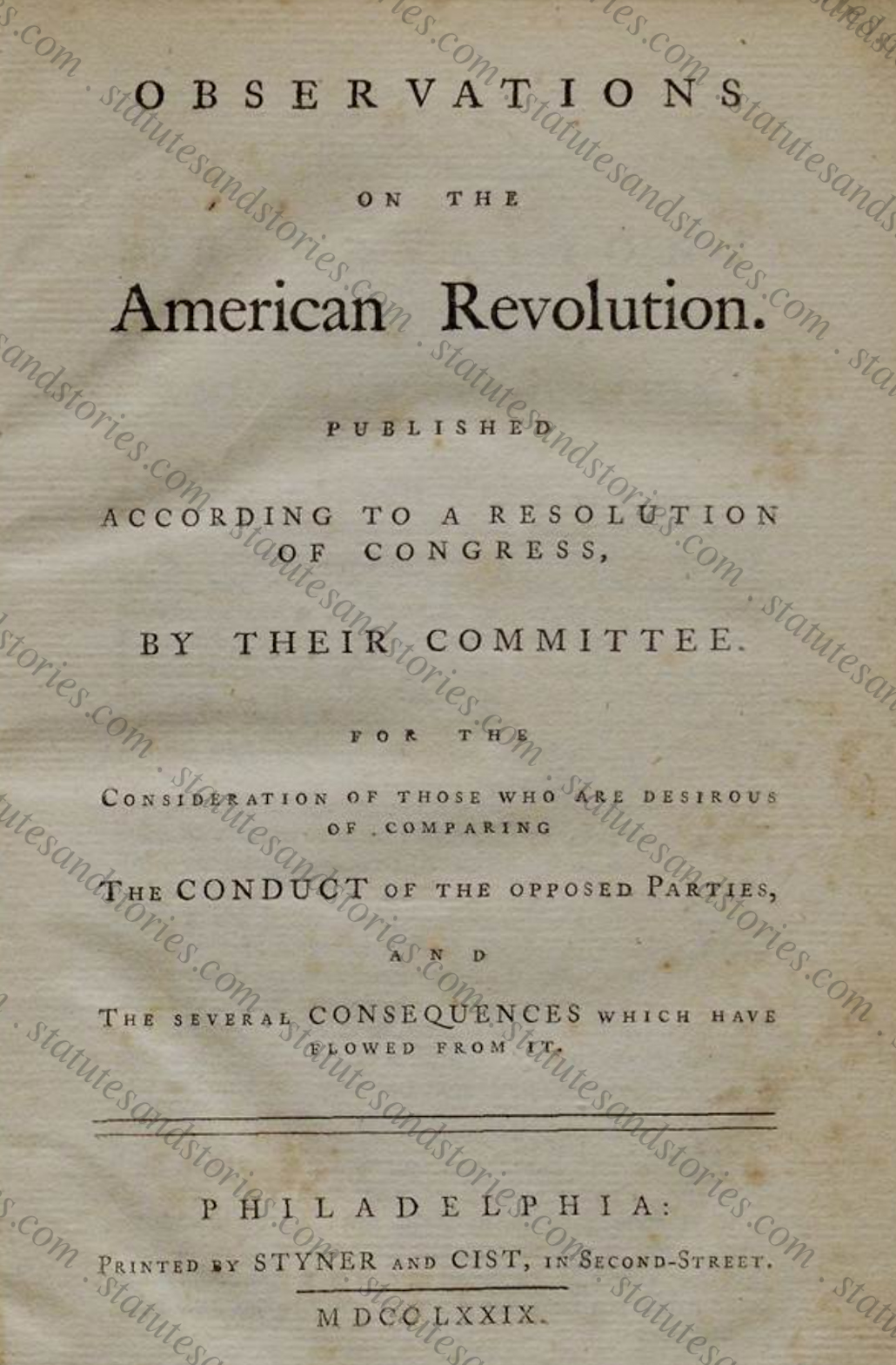 Congress understood the importance of Observations, printing 1,3000 copies of the 122-page pamphlet for distribution around the country.[15] The 3,000 word monograph was printed in Philadelphia using soft cover bindings. Today the work would be described as the equivalent of a Congressional white paper. “The publication was the nearest Congress ever came to issuing an official history of the revolution.”[16] In addition to providing a review of Anglo-American relations, the work was an effort to demonstrate British responsibility for the war, American resolve, and the inevitability of American independence.