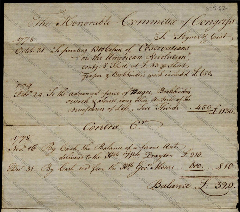 [7] Congress authorized payment of $2,986 to Stiner & Cist for printing of 1,300 copies of Observations on April 5, 1779. JCC, 13:421.