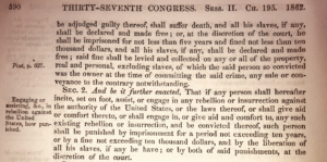 Click here for a link to the Act, which contains 14 sections. The first section of the Act declared that anyone adjudged guilty of treason “shall suffer death and his slaves, if any, shall be declared and made free…” Section 3 provided that every person guilty of insurrection “shall be forever incapable and disqualified to hold any office under the United States.” Six years later, Section 3 of the Fourteenth Amendment would similarly bar from public office any person who took an oath of office to support the Constitution who engaged in insurrection or rebellion against the United States.