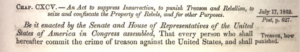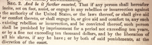 Section 2 of the Confiscation Act of 1862 is pictured below. It is substantially similar to 18 U.S.C. §2383, with only minor revisions adopted in 1948 and 1994. The marginal notations contained in the 1862 Act label Section 2 as “Engaging or assisting &c., in rebellion against the United States, how punished”: