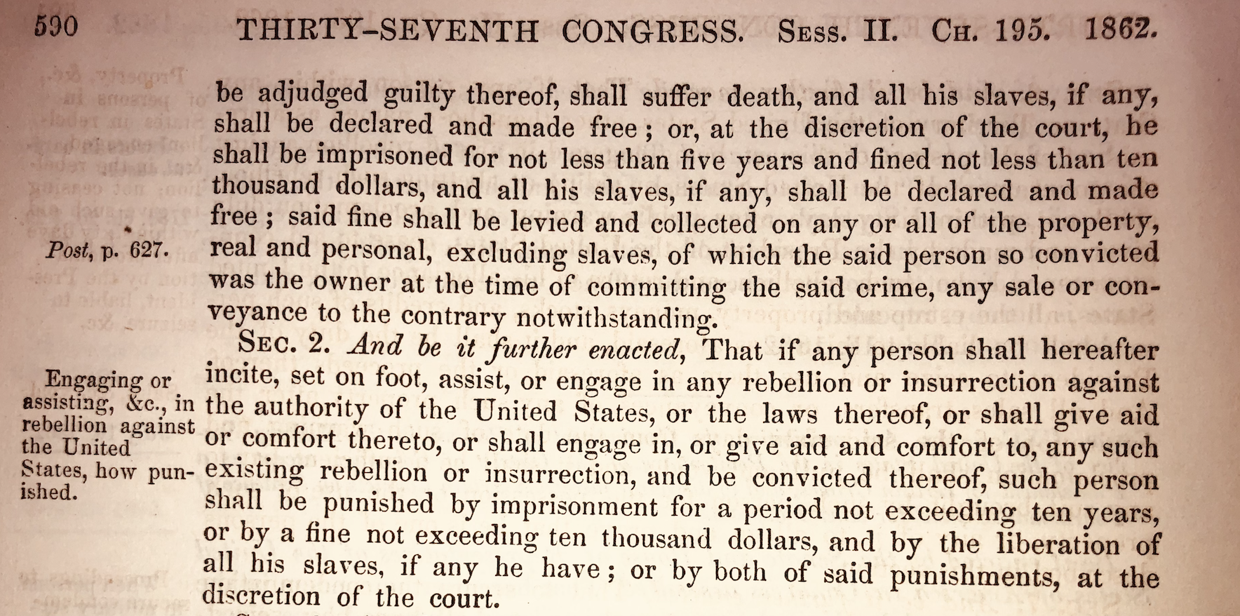 During the bleakest days of the Civil War, the Thirty-Seventh Congress enacted the Second Confiscation Act on July 17, 1862. Formally know as “An Act to suppress Insurrection, to punish Treason and Rebellion, to seize and confiscate the Property of Rebels, and for other Purposes,” the 1862 Act was an effort to expand the tools available to President Lincoln to help win the Civil War. The 1862 Act was also a step forward in the effort for universal emancipation and abolition of slavery.