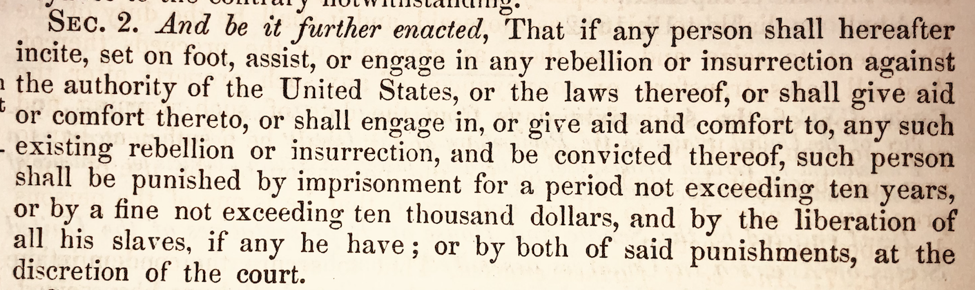 Section 2 of the Confiscation Act of 1862 is pictured below. It is substantially similar to 18 U.S.C. §2383, with only minor revisions adopted in 1948 and 1994. The marginal notations contained in the 1862 Act label Section 2 as “Engaging or assisting &c., in rebellion against the United States, how punished”: