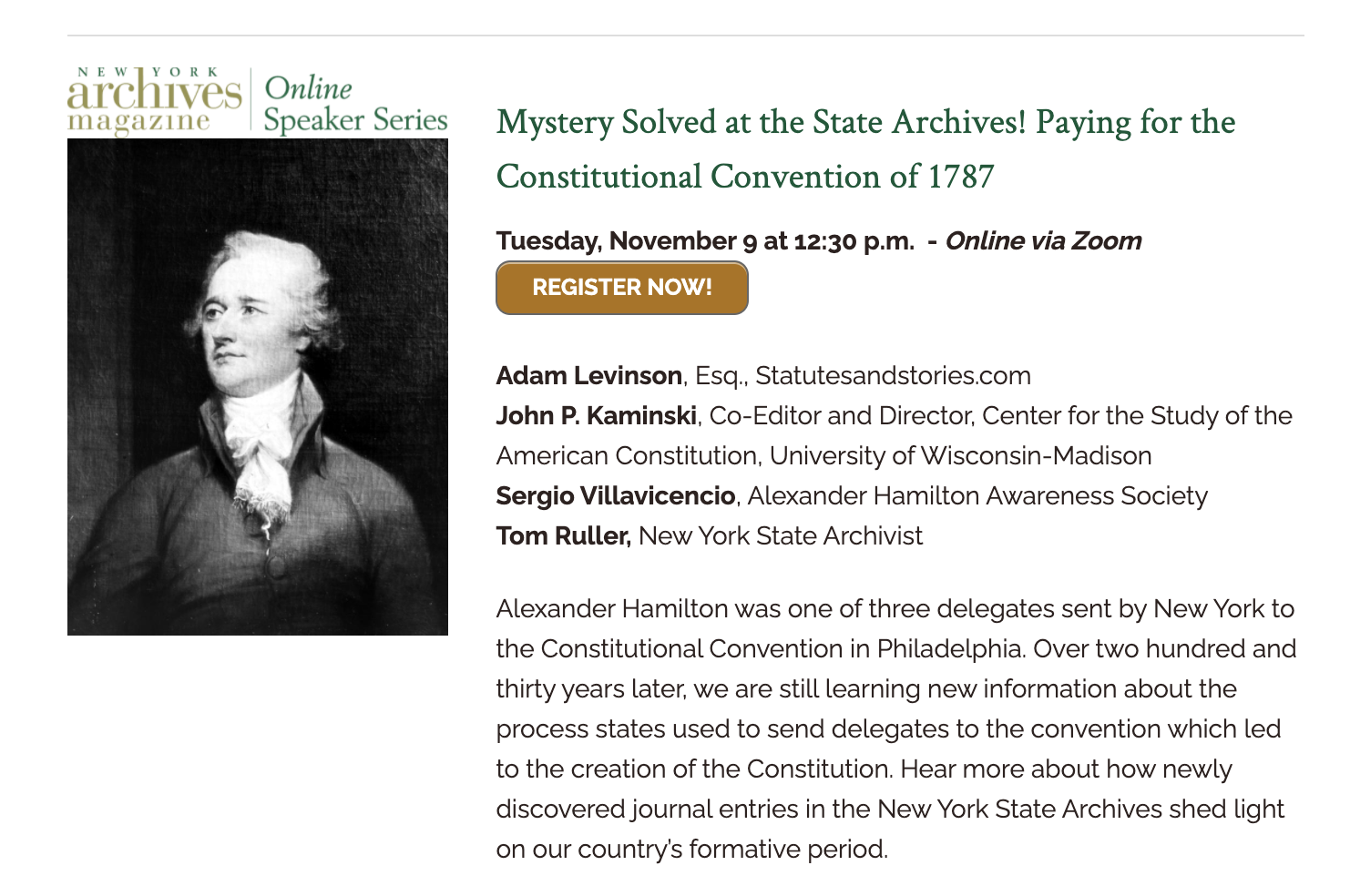 It is an honor and privilege to be able to present our ongoing research with Professor John Kaminski of the Center for the Study of the American Constitution, Sergio Villavicencio of the Alexander Hamilton Society, and New York State Archivist Tom Ruller.