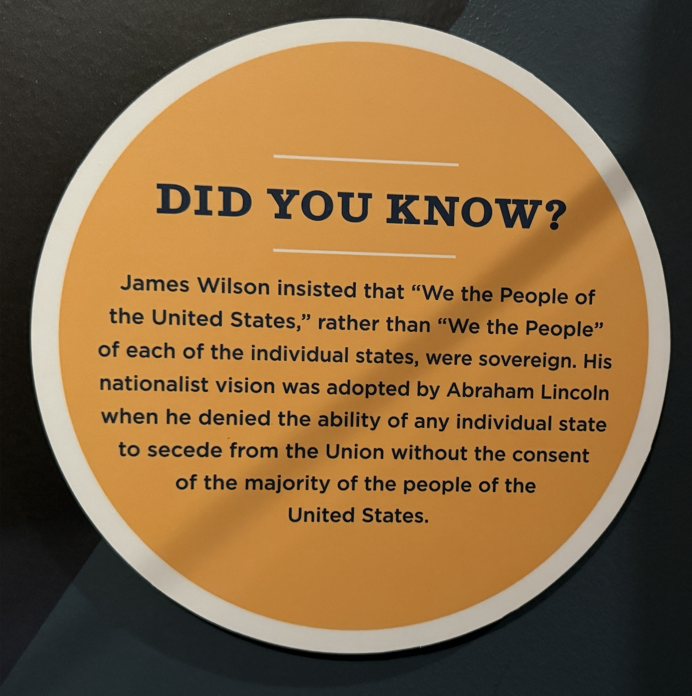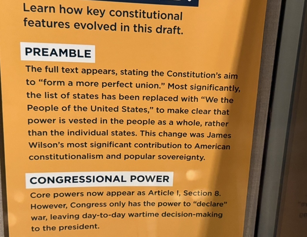 Pictured below is the NCC’s prior exhibit which erroneously suggested that James Wilson was responsible for the final draft of the Preamble.