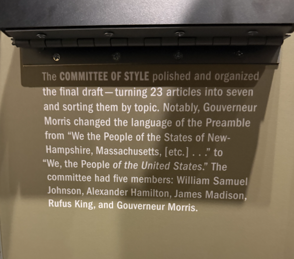 Copied below are images from the NCC’s new exhibit which accurately reflects Gouverneur Morris’s authorship of the soaring text of the Preamble. Among other things, in September of 1787 Morris and the Committee of Style revised James Wilson’s August draft from the Committee of Detail  to recognize that the Constitution was established by “We the People of the United States” rather than We the People of the states, which were listed from north to south.